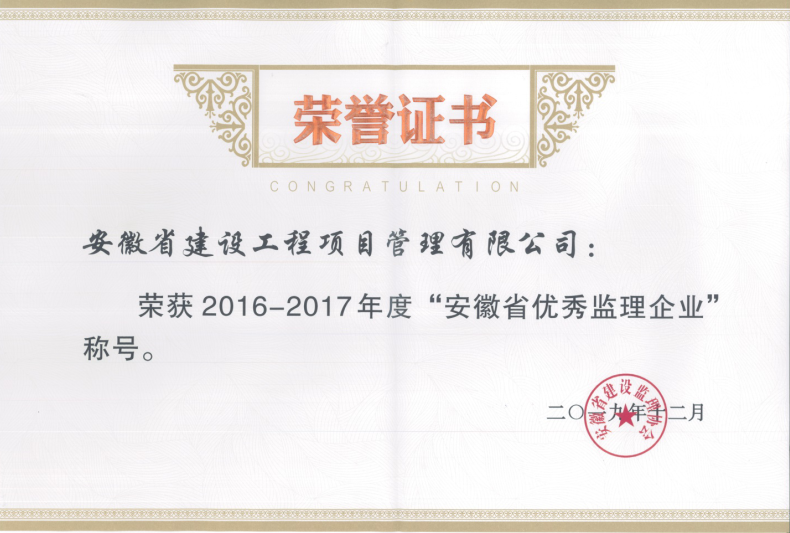 近期,安徽省建设监理协会公布了“关于表扬2016-2017年度安徽省优秀监理企业和优秀总监理工程师、优秀监理工程师通知”。我公司在此次评选中荣获2016-2017年度安徽省优秀监理企业;刘坤、程建云荣获2016-2017年度安徽省优秀总监理工程师;方正荣获2016-2017年度安徽省优秀监理工程师。